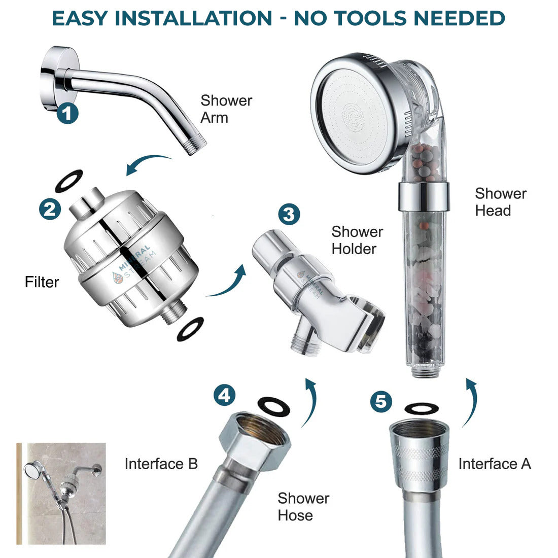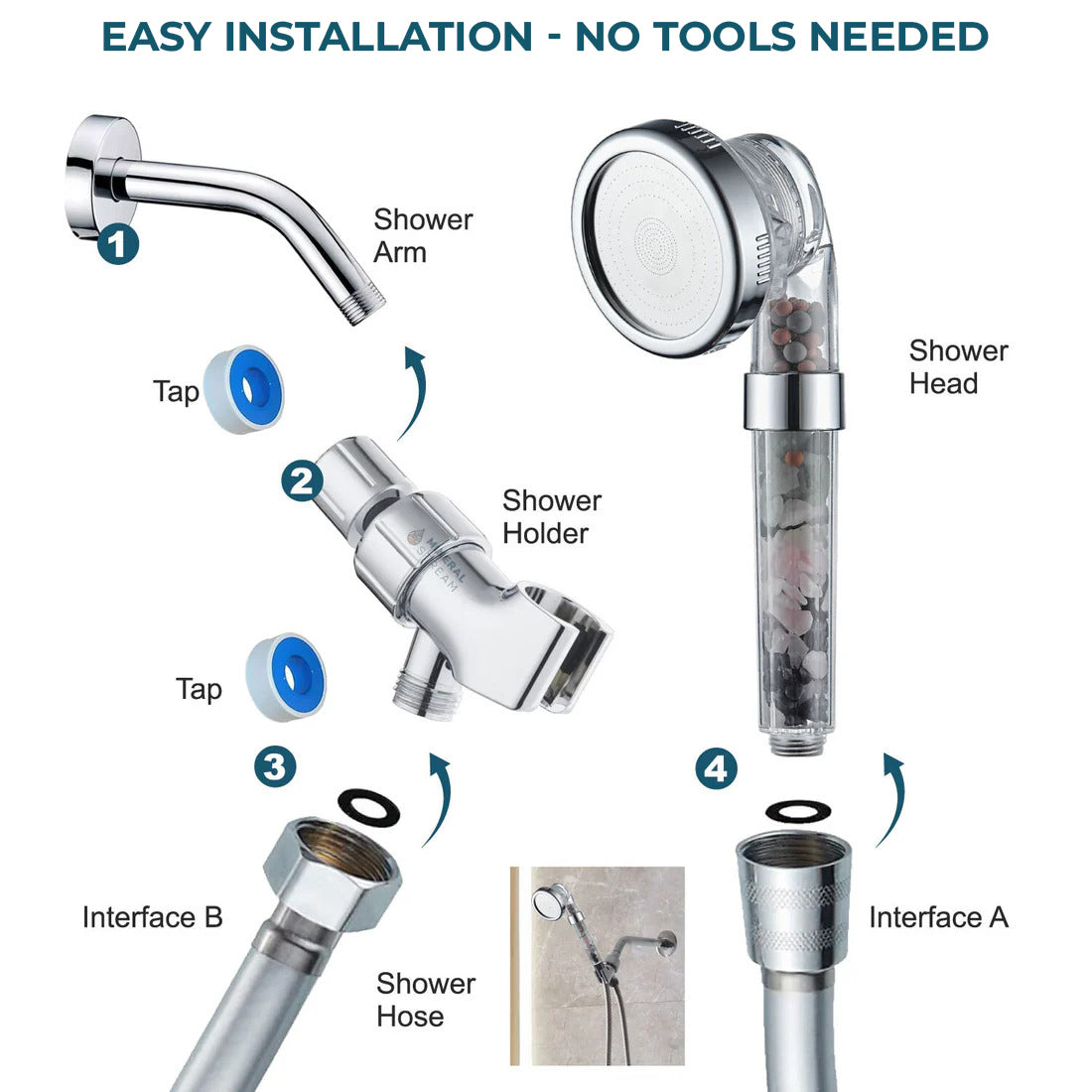 - No necesita herramientas. Conecte la ducha de mano MineralStream al conector Interfaz A. Apriete a mano hasta que quede firme.