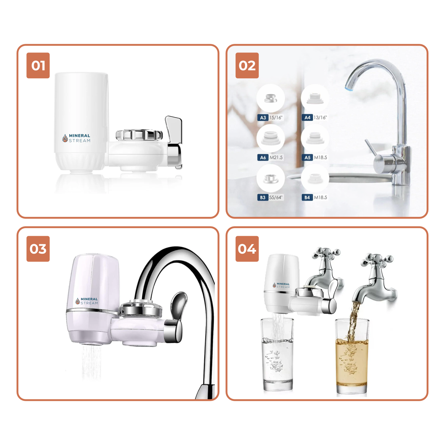Seleccione el adaptador correcto para su grifo entre los 6 incluidos: - A3 (15/16") — A4 (13/16") — A5 (M18.5) — A6 (M21.5) — B3 (55/64") — B4 (M18.5). Retire el aireador de su grifo y enrosque el adaptador correspondiente. - Conecte el filtro a su grifo