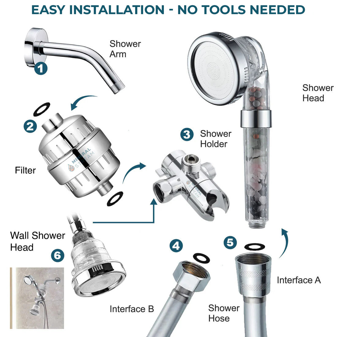 - Enrosque la alcachofa filtrante MineralStream directamente en el brazo de ducha. Apriete a mano hasta que quede firme.