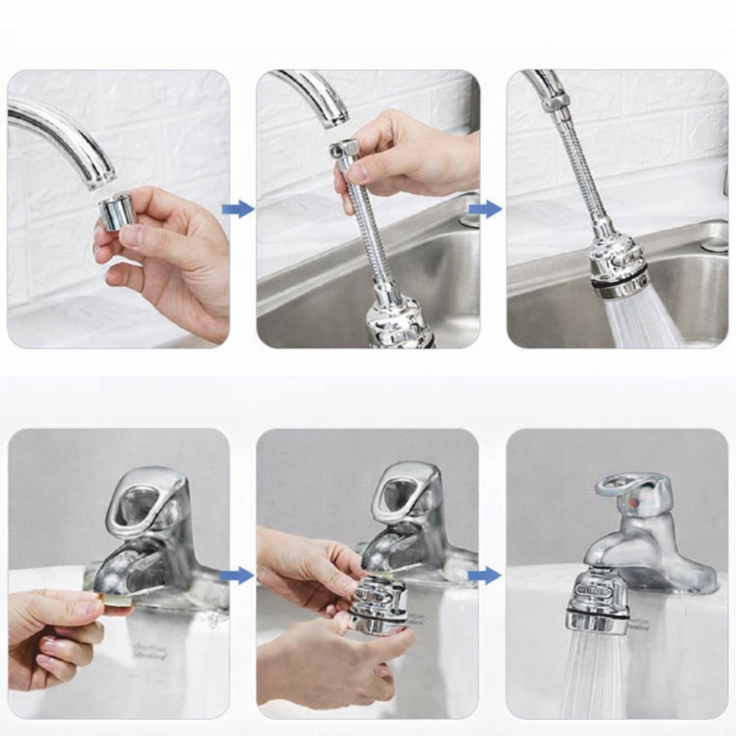 - Retirar: Desenrosque la punta de su grifo actual (aireador) a mano o con un paño para mejorar el agarre.