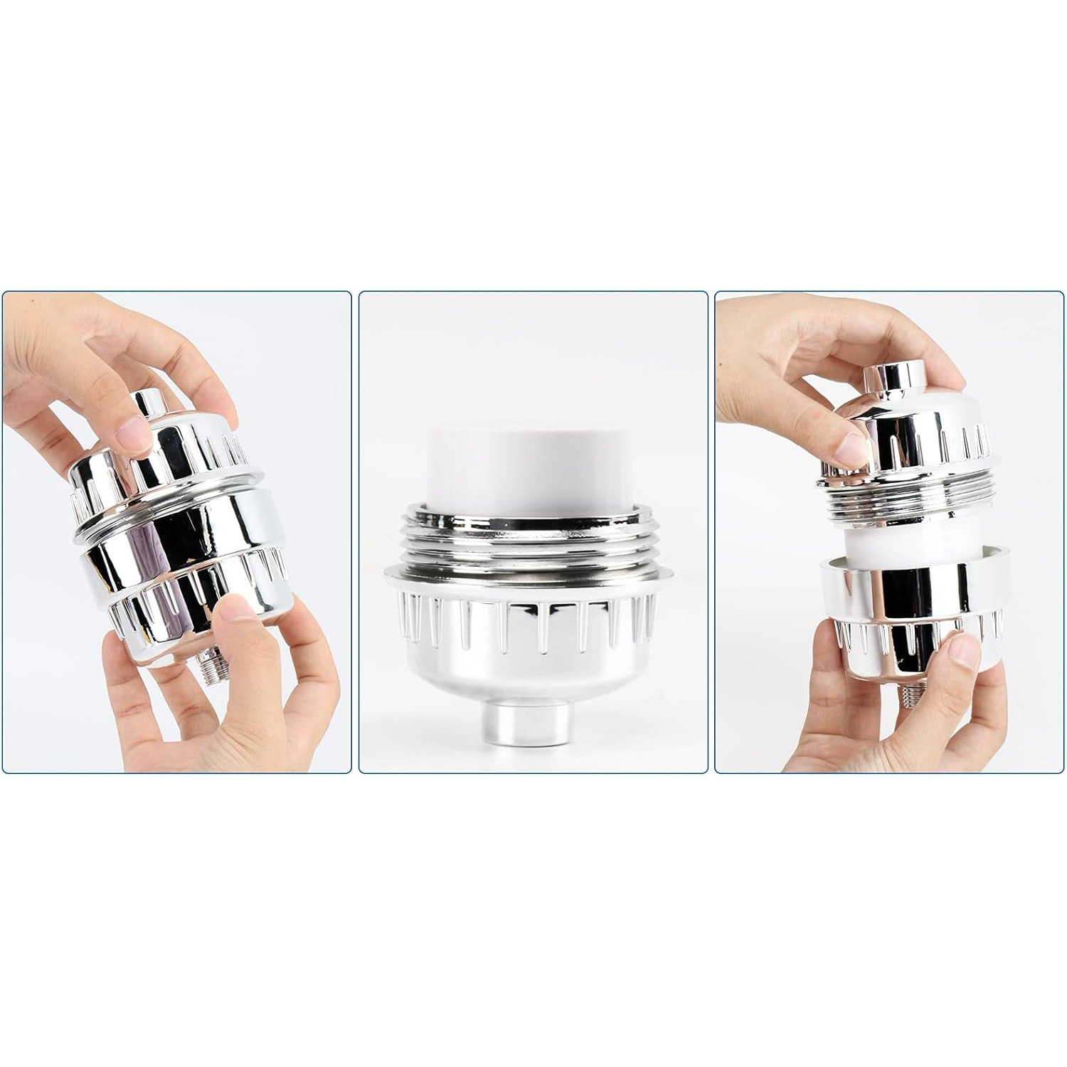 - Coloque el filtro antical: Aplique cinta de fontanero en el sentido de las agujas del reloj tanto en las roscas del brazo de ducha como en la entrada del filtro. Enrosque el filtro antical en el brazo, observando la dirección del flujo, y apriete a mano.