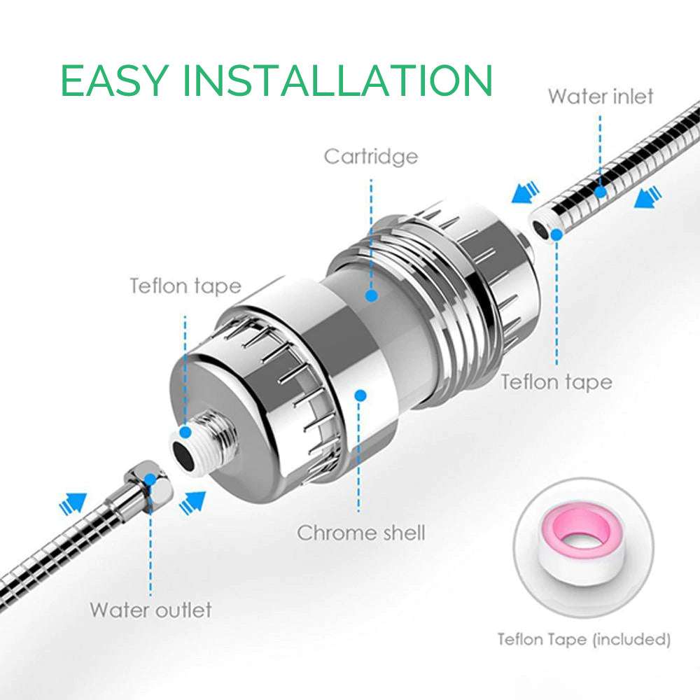 Instale fácilmente este filtro de cabezal de ducha para agua dura. No necesita herramientas: solo apriete a mano y un poco de cinta de plomero incluida. Sin fugas ni grietas. ¡Compatible con cabezales de ducha de pared, de mano, de lluvia y combinados!